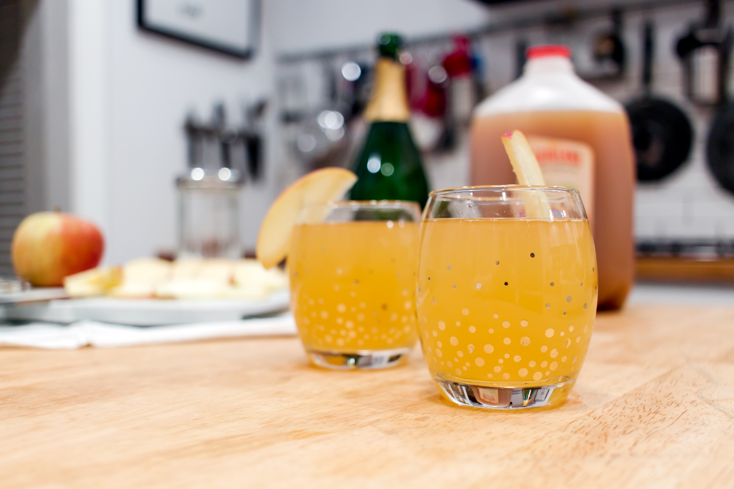 Fill your glass halfway with cold apple cider and top with chilled champagne. Garnish with an apple slice sprinkled with sugar and enjoy!