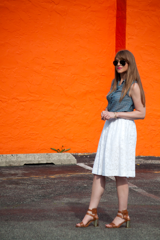 {H&M top (old, similar from Asos); J. Crew skirt; ℅ Just Fabulous Mayah sandals; ℅ Miriam Merenfeld necklace; Ray Ban sunglasses}