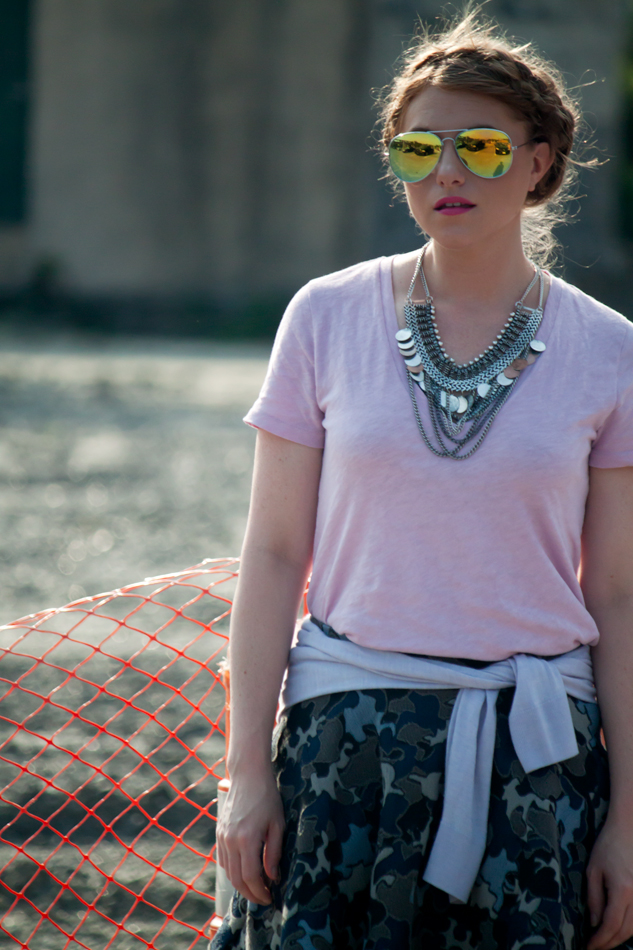 {Zara skirt (similar from Asos); J. Crew tee and sweater; H&M necklace; ShoeDazzle sandals; eBay sunglasses}