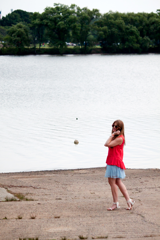 I toned it down for the fourth of July this year — okay, no I didn’t, I (temporarily) dyed my hair blue and wore an American flag sweater for the actual night-of festivities, but what can I say I love a good excuse for theme-dressing. I would wear this combo any summer day though. The pared-down coral-red, baby blue, and white pairing was perfectly patriotic for the holiday weekend, but just as appropriate for any time.