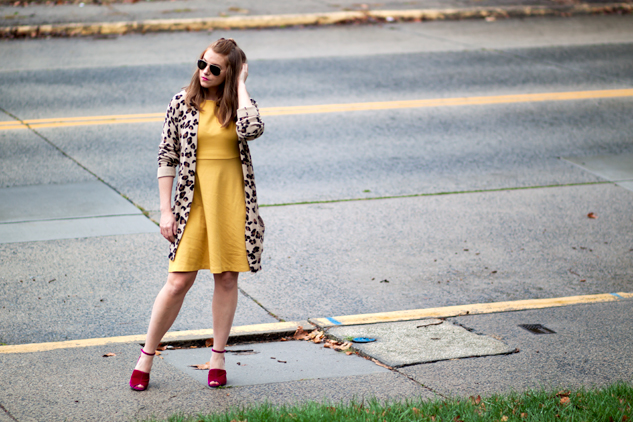 I spotted this hairstyle on a Lucky Magazine guide and decided I had to give a spin on it a whirl. The mini bun didn’t quite fit my look, but it was a fun half-up/half-down ‘do that made rainy day hair a whole lot easier and fit well with a quirky, colorful outfit.