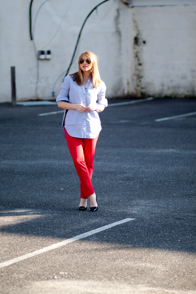 {New York & Company pants; J. Crew top; ShoeMint heels; Ray Ban sunglasses}