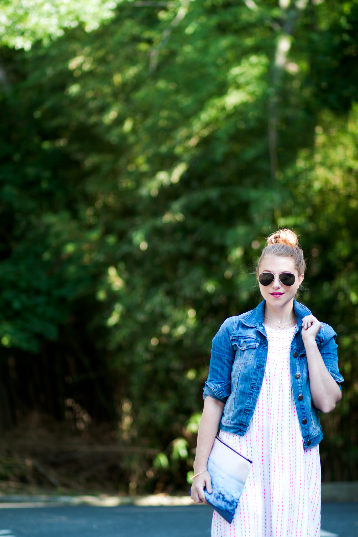 {Lou & Grey dress from Loft; J. Crew jacket and necklace; c/o Redbubble “Crash into Me” clutch; Betula Licensed by Birkenstock sandals from Kohl’s; LC Lauren Conrad bracelet from Kohl’s; Ray Ban Sunglasses}