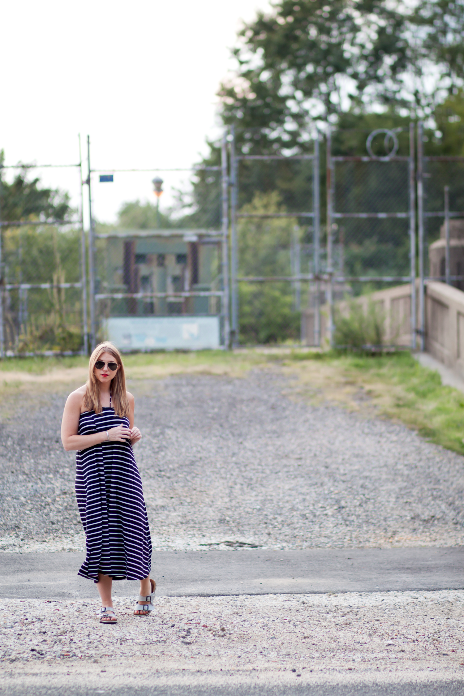 I’ve begun mentally putting together a fall shopping “want list” and striped midi dresses are hitting high on it. The kinds that evoke 70s vibes that will pair perfect with fringe and booties, but also work well with sneakers and even summer sandals. Since I’m not ready to dive into fall yet, I’m trying to make use of the warm-weather stripes already in my closet.