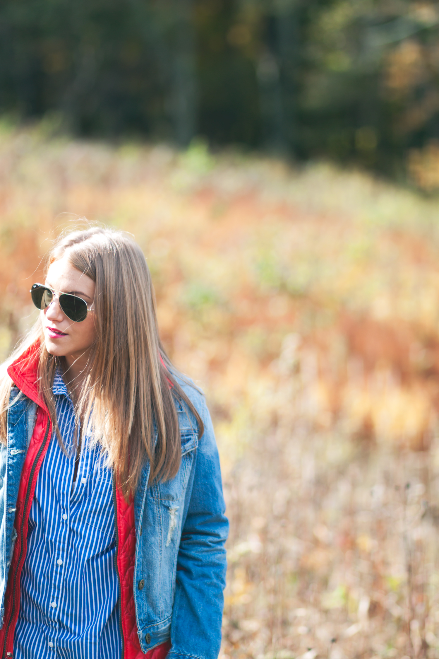 Fabletics Lima capri pants; Forever 21 boyfriend shirt; The North Face jacket; Mudd denim jacket from Kohl’s; Converse sneakers; Forever 21 socks; Ray Ban sunglasses