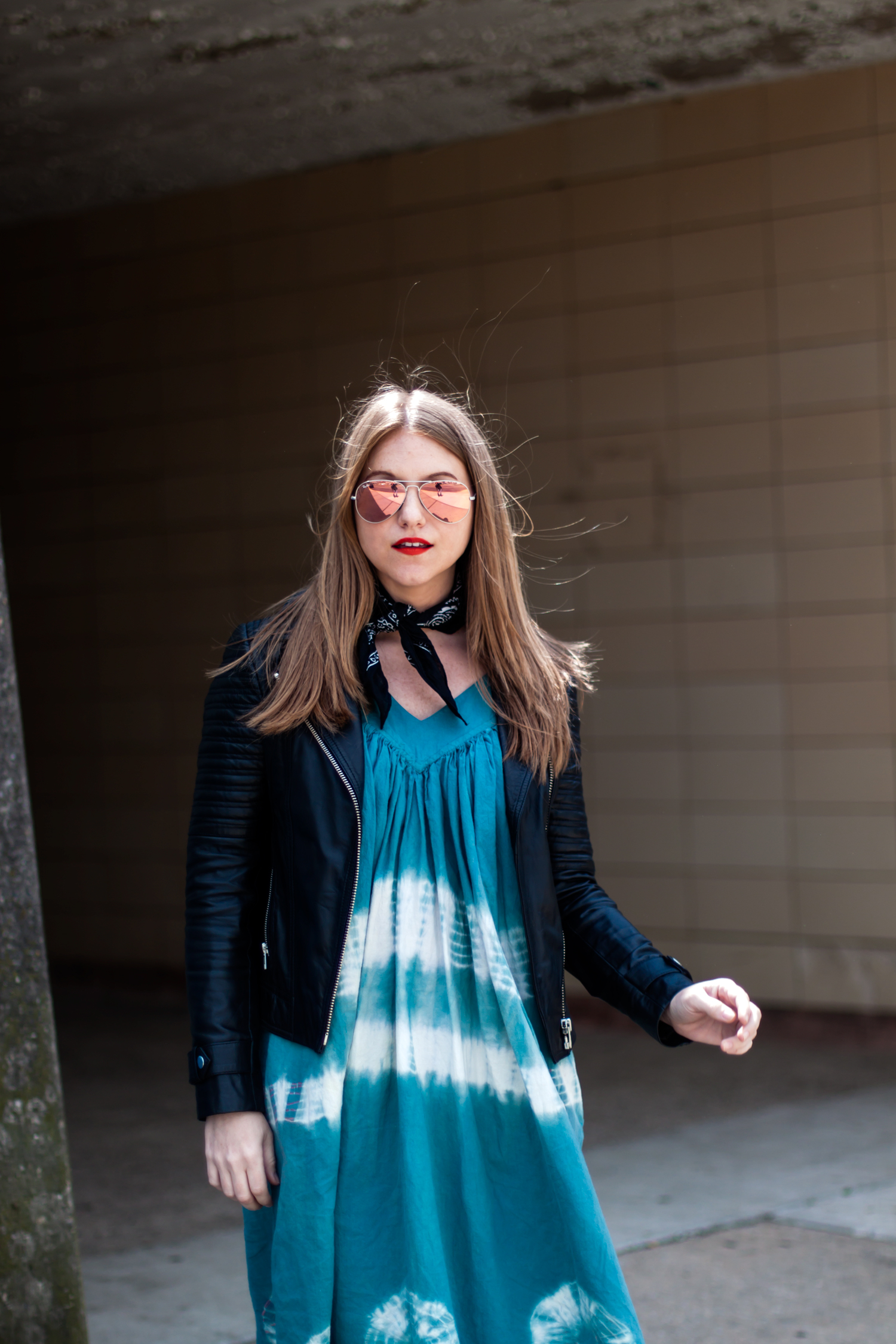 misc. dress (very similar dress from Zara); Asos jacket; Just Fabulous shoes; Ray Ban sunglasses; Urban Outfitters bandana
