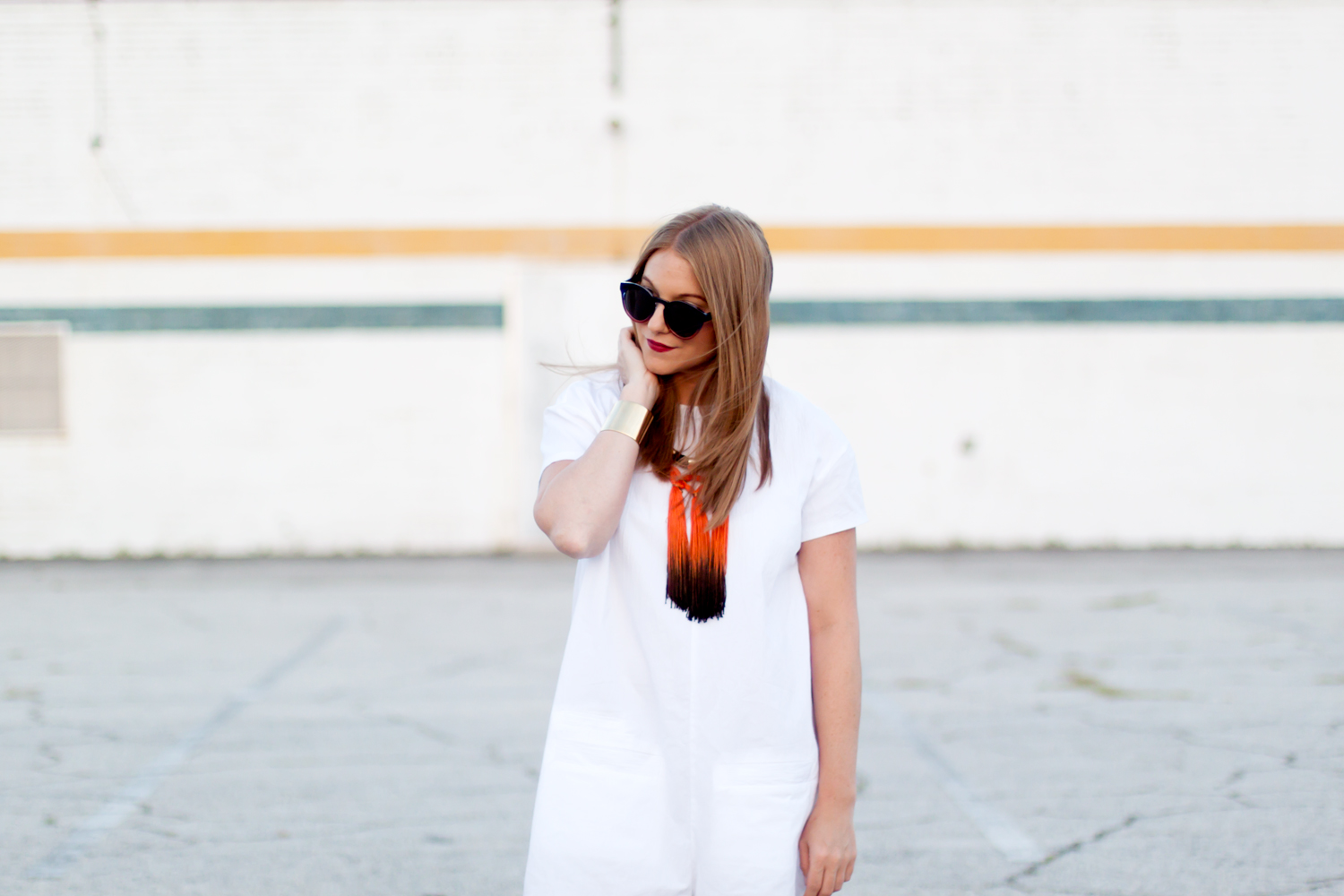 I love rompers since they bring the ease of a dress with the coverage of shorts, and a little white one is like a blank slate you can leave fresh and plain or dress up or down in a million ways. A statement necklace and a basic black sandal make a big impact on a simple piece.