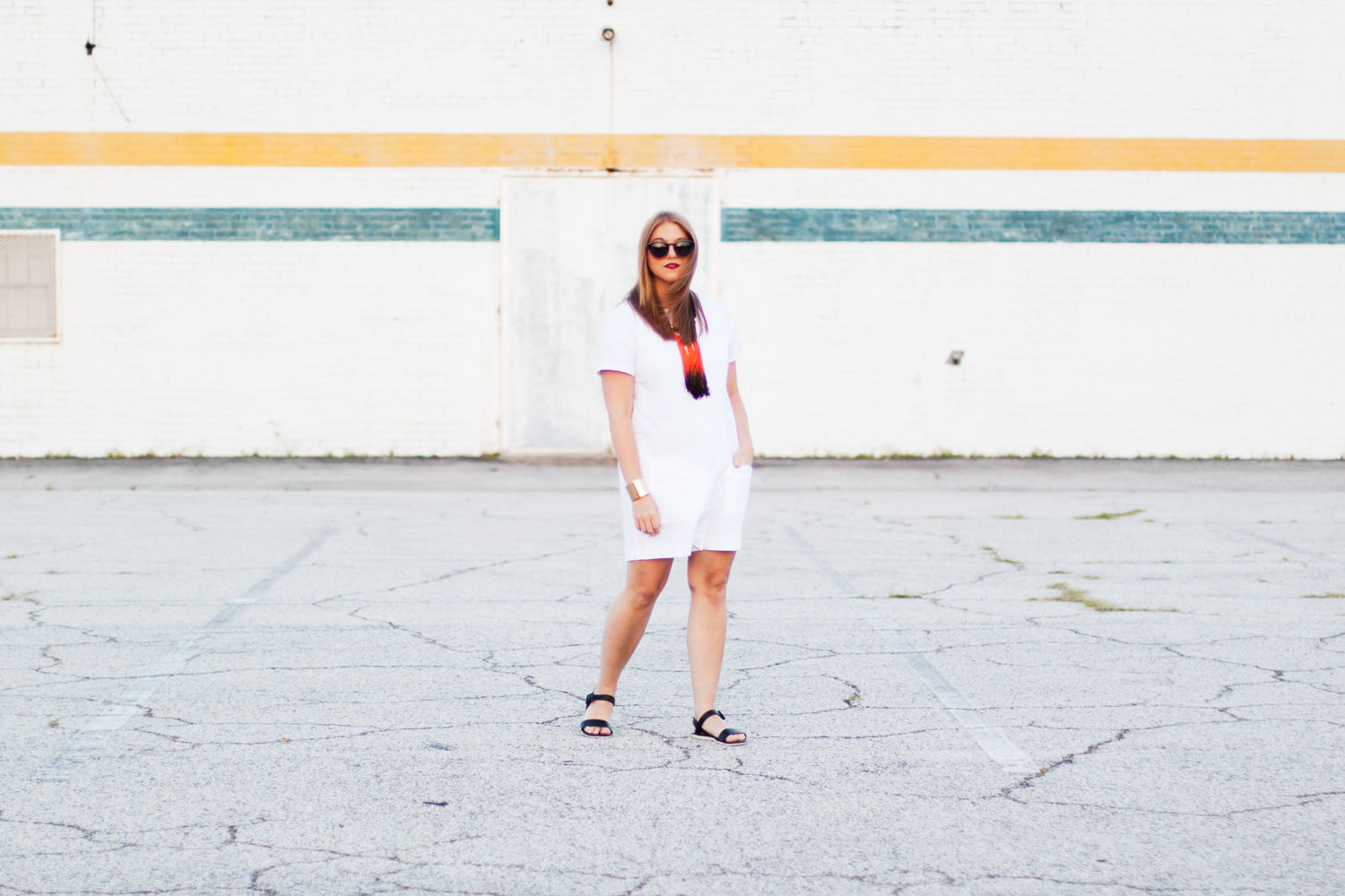 I love rompers since they bring the ease of a dress with the coverage of shorts, and a little white one is like a blank slate you can leave fresh and plain or dress up or down in a million ways. A statement necklace and a basic black sandal make a big impact on a simple piece.