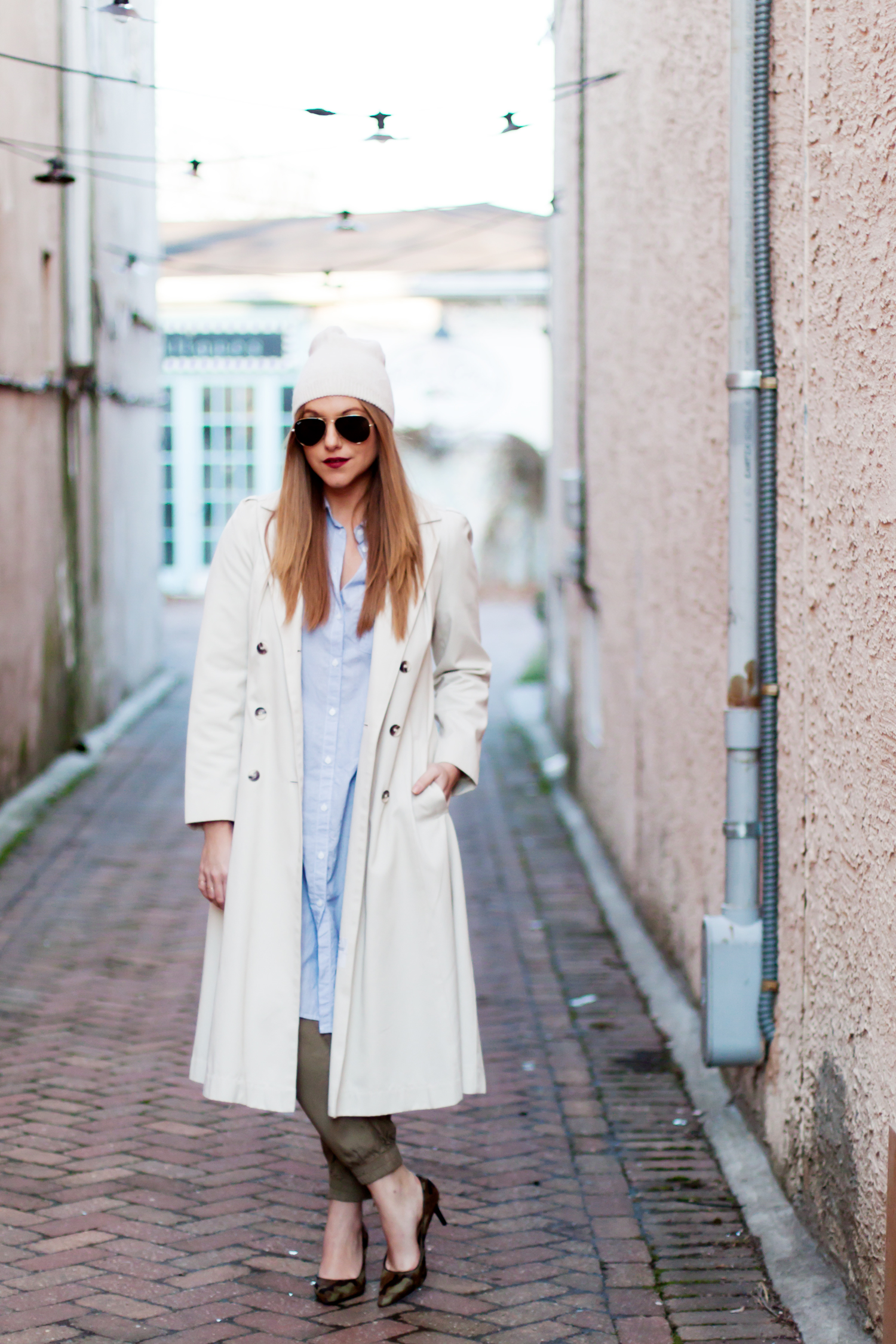 I’ve been toying with the idea of trying out the dress over pants trend for a while now and a button-down shirt dress seemed like the most natural way to approach it.  So yesterday morning I reached for a blue striped shirt dress I’d previously decided would have to wait until spring, and threw it on over a (very old) pair of comfortable green pants.  It turns out I really liked the combo, even if my guy compared me to a middle school art teacher.  Paired with a vintage trench coat and heels it was a perfect blend of pulled together and relaxed.