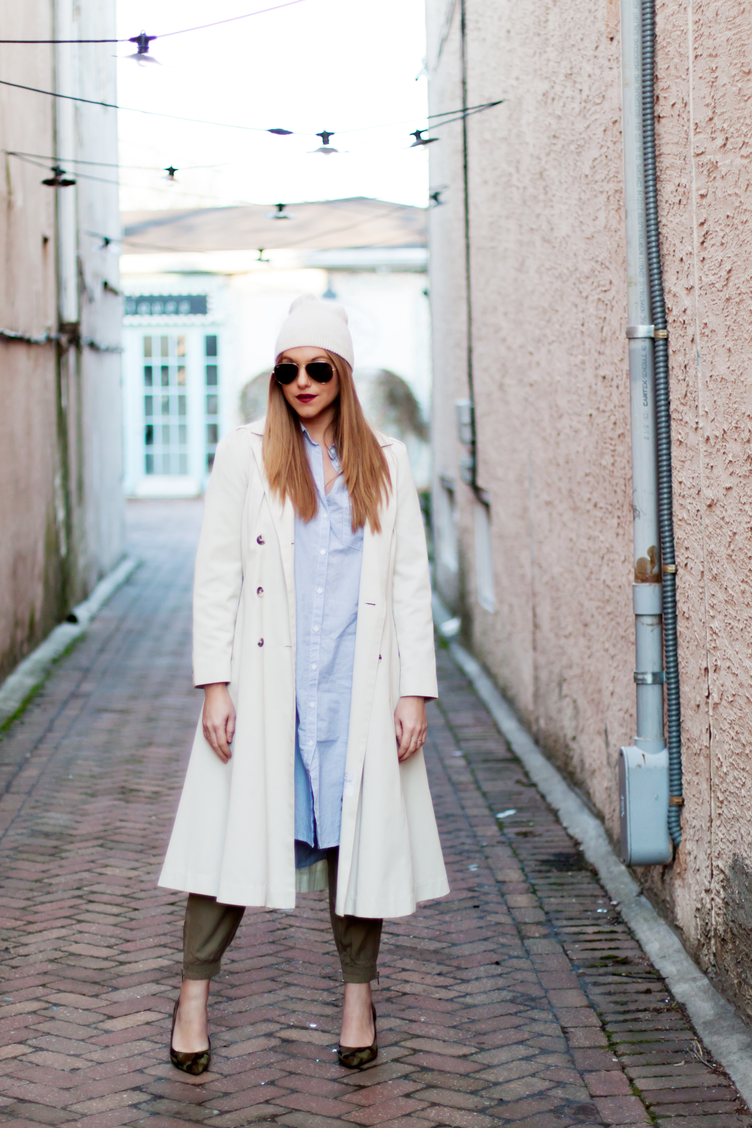 I’ve been toying with the idea of trying out the dress over pants trend for a while now and a button-down shirt dress seemed like the most natural way to approach it.  So yesterday morning I reached for a blue striped shirt dress I’d previously decided would have to wait until spring, and threw it on over a (very old) pair of comfortable green pants.  It turns out I really liked the combo, even if my guy compared me to a middle school art teacher.  Paired with a vintage trench coat and heels it was a perfect blend of pulled together and relaxed.