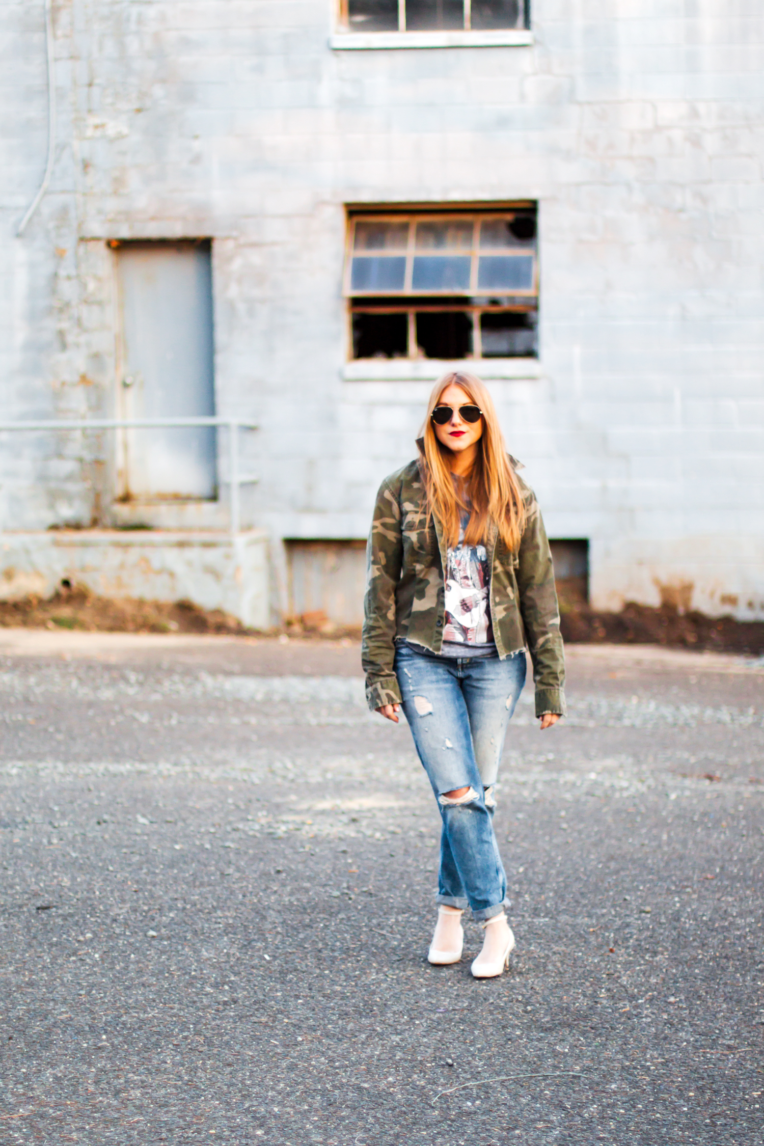 Sometimes something as simple as a band tee can give you a little edge. Throw on a distressed camo jacket, ripped boyfriend jeans, and heels and suddenly you’re walking around with a little more attitude. And some days, you just need that.