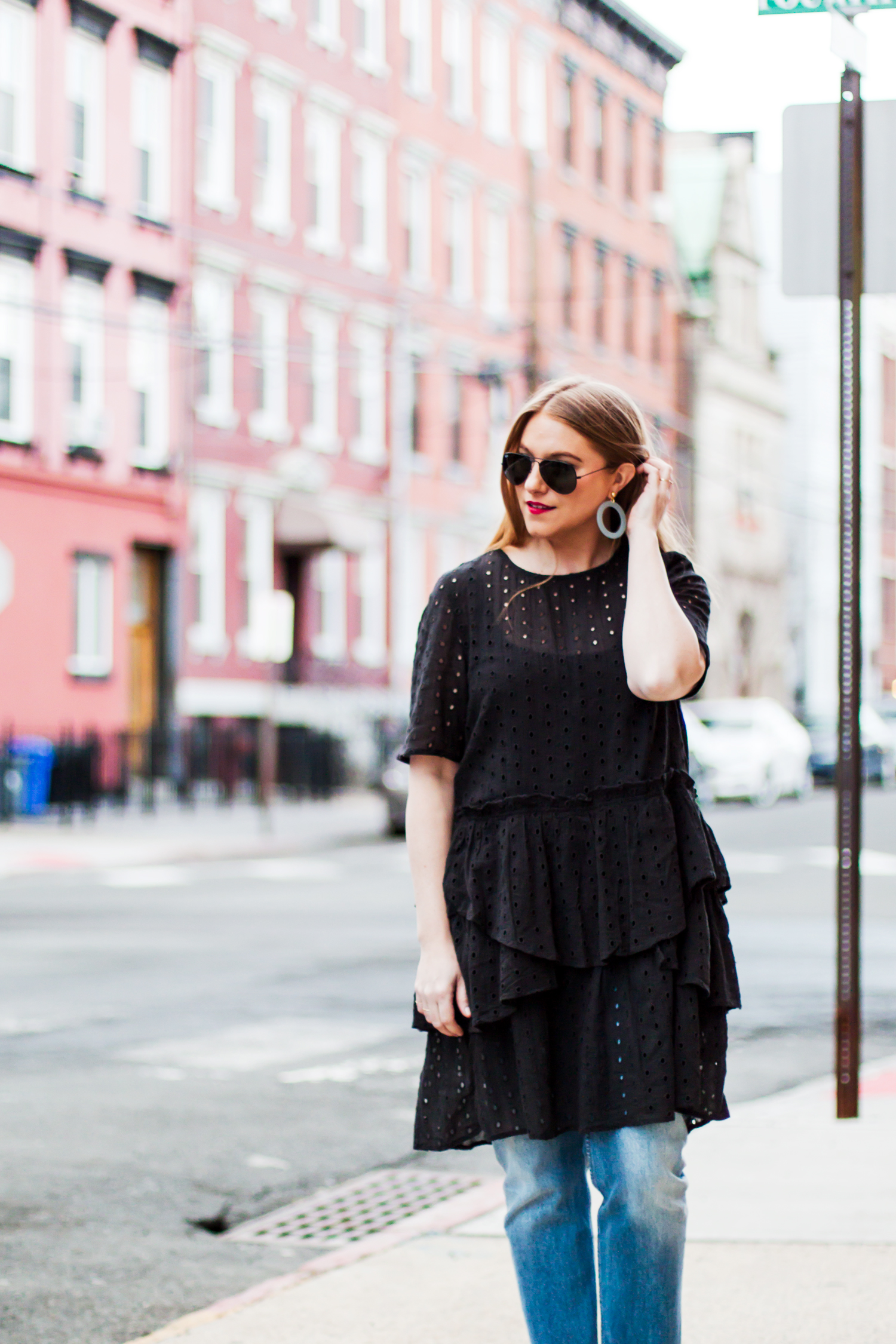I’ve been really into the idea of dresses over pants for some time now, but I’ve been reluctant to really dive in. Part of this has to do with the fact that I’ve been much more likely to reach for flats instead of heels lately, and you generally need that elongated effect a heel gives to somewhat successfully pull it off. This weekend we had a birthday party to go to though, and I wanted to be comfortable and have a little fun with my style so it seemed like the perfect occasion to give it a go.