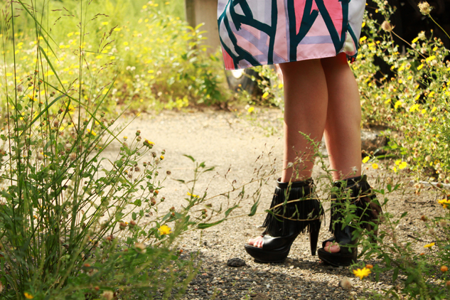 The bf and I ended up needing to take a trip to a scrap yard yesterday to look for car parts. It’s actually a pretty interesting place, but I was most amazed by how nature always seems to find a way, no matter the surroundings. Delicate yellow flowers bursting through crumbling asphalt and climbing up the sides of abandoned trucks created a natural contrast of beauty and ruggedness. I realized later that my outfit happened to coincide with that theme with the toughness of these fringed booties and the pretty purple, pink and jewel embellishments of this shift. Although next time I’ve got to visit a junkyard, I think maybe I’ll be leaving the heels at home.