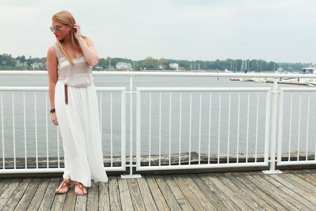 {Asos skirt; Aerie for American Eagle tank and lace bandeau top; American Eagle sandals; Ray Ban aviator sunglasses; misc. woven belt, bracelets and earrings}