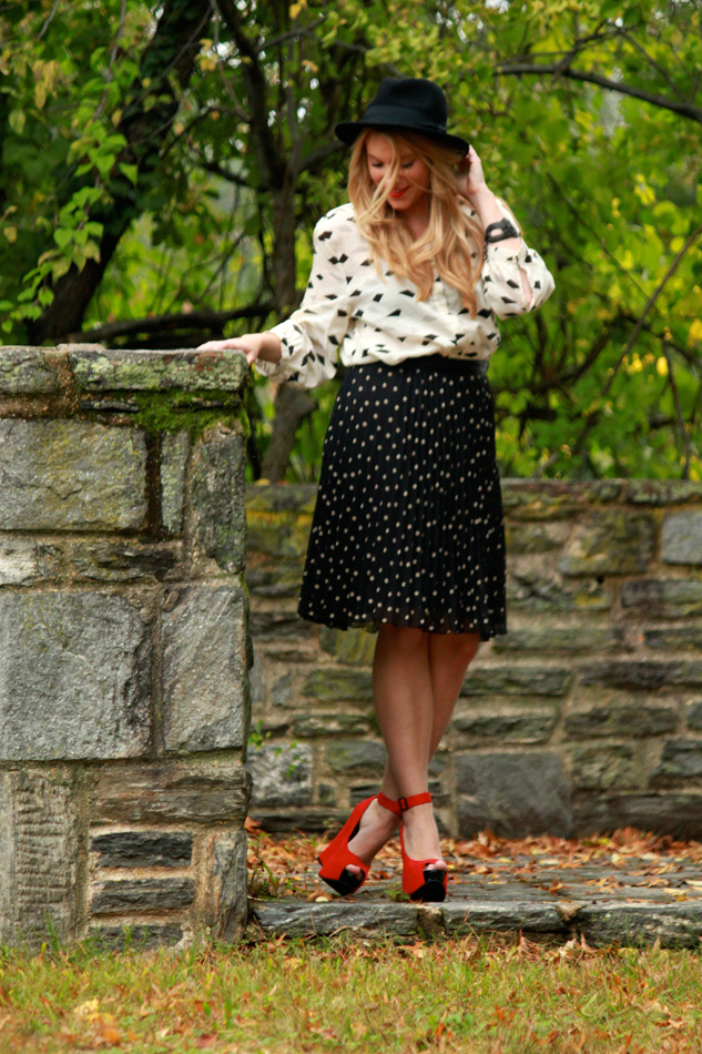 {Forever 21 blouse and bracelet; H&M skirt and hat; Luichiny wedges via Akira}