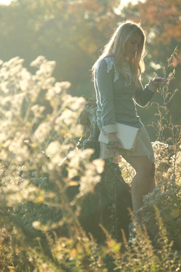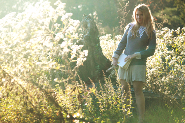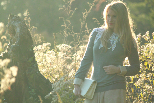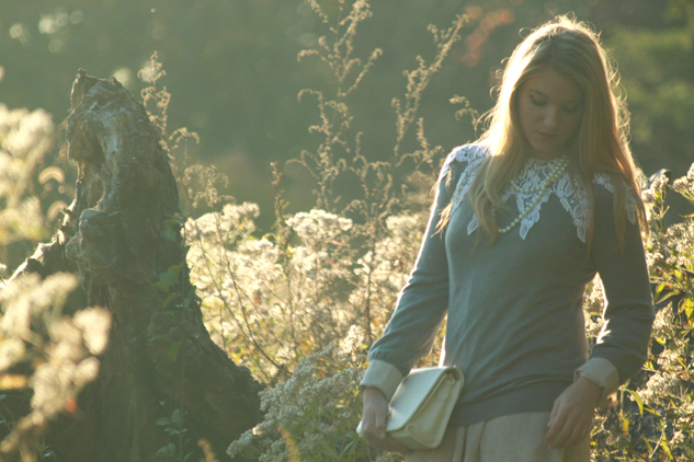 {d.i.y. vintage lace collar; Forever 21 sweater; H&M dress (also seen here); Aldo wedges; vintage pearl necklace and purse}