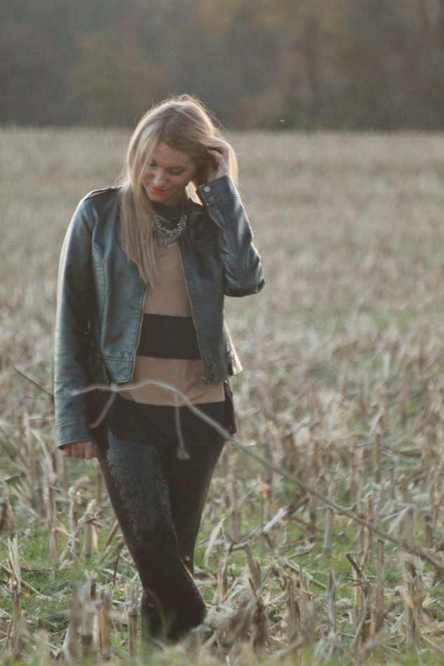 {H&M sequin pants and striped top; Forever 21 faux leather jacket; Gemma Redux necklace; Steve Madden booties; misc. earrings}
