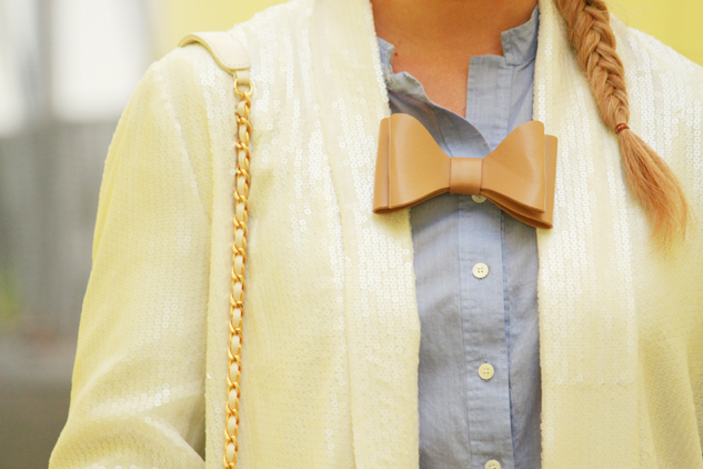 Perhaps lack of sleep played a contributing factor, but I was feeling extra playful in terms of style yesterday. Putting a twist on the traditional blazer and trouser combo with some sequins and mauve-pink silk was a good start; transforming this barrette into a fun little bow tie added just a bit more quirk.