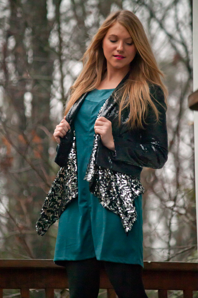 {H&M sequin jacket; Karen Kane sequin vest; Forever 21 shift dress; Bakers booties; Spanx reversible tights; misc. earrings}