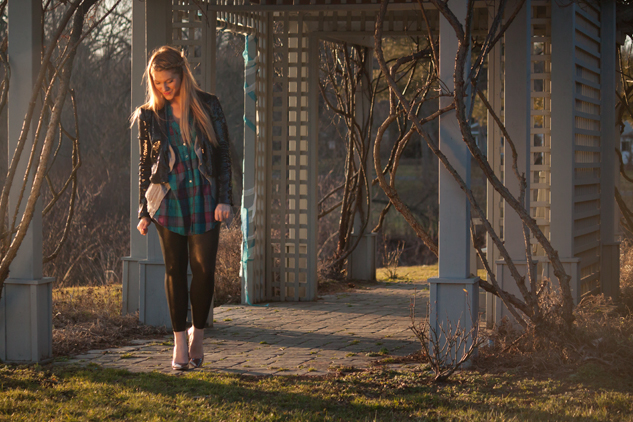 Jam packed weekends are made a little more manageable with an outfit that combines elements that make the transition from day to night a breeze. Black leggings with a bit of shine are laid back with a plaid tunic and long cardigan for day, but a sequin blazer and metallic heels makes the shift to evening-ready effortlessly.