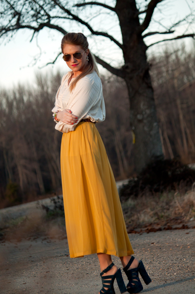 I love the spring-like weather we’ve been having lately even though I have sort of missed having a true winter. I should bite my tongue since we’re due to have some snow today, but nevertheless I happily took advantage of yesterday’s beautiful weather and threw on an easy, semi-sheer skirt. Although I only faked being brave enough to bare my pale legs (thank you nude tights) I still got excited by the idea of open toe shoes and freshly painted pedicures. Bring on spring!