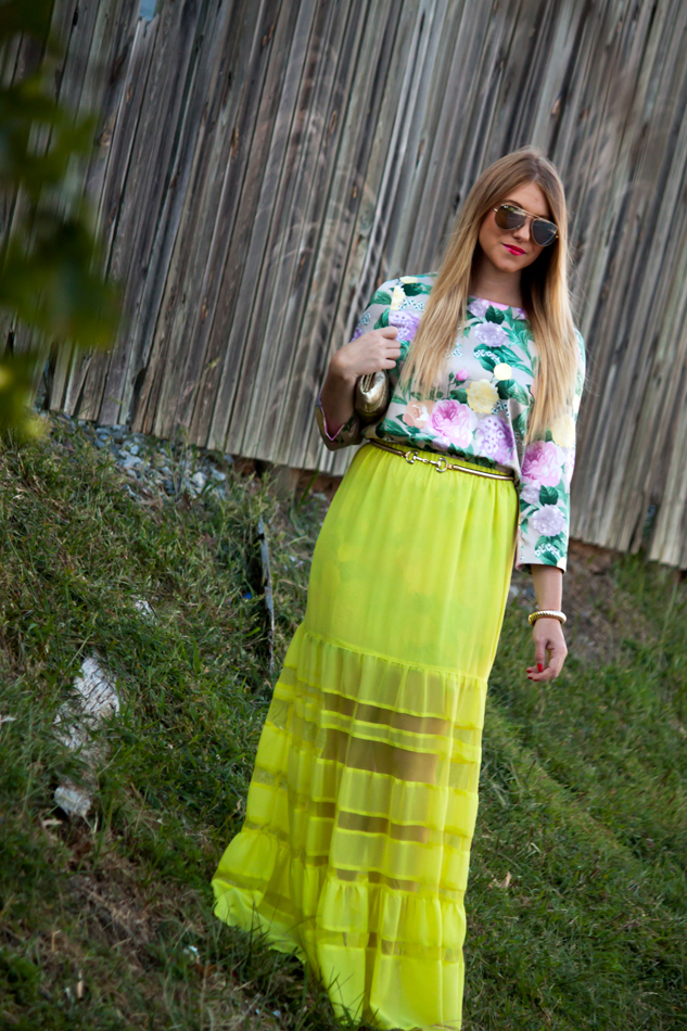 Last night I attended an event celebrating the XIX Most Fashionable Women in Philadelphia, where the room was filled with some of the most inspiring women the city has to offer. Among the honorees there was a culinary personality, a 2-time Olympic champion, a CBS news anchor, and a talented interior designer, to name only a few. Knowing I was going to be in a room with so many empowering (and stylish!) women, I knew I wanted to wear something both comfortable and fun, which of course almost always translates to a bright, bold maxi for me, so I paired this neon number (also seen here and here) with a floral dress-turned-top and a few vintage finishing touches.