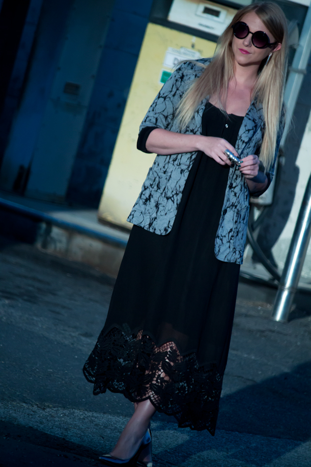 It’s rare for me to stick to a completely grey and black color palette without being tempted to throw in a bright shoe or piece of jewelry, but sometimes the details make more of a statement than a pop of color ever could. Elegant lace, a splatter-print blazer, and a few metallic touches create a bit of gothic charm.