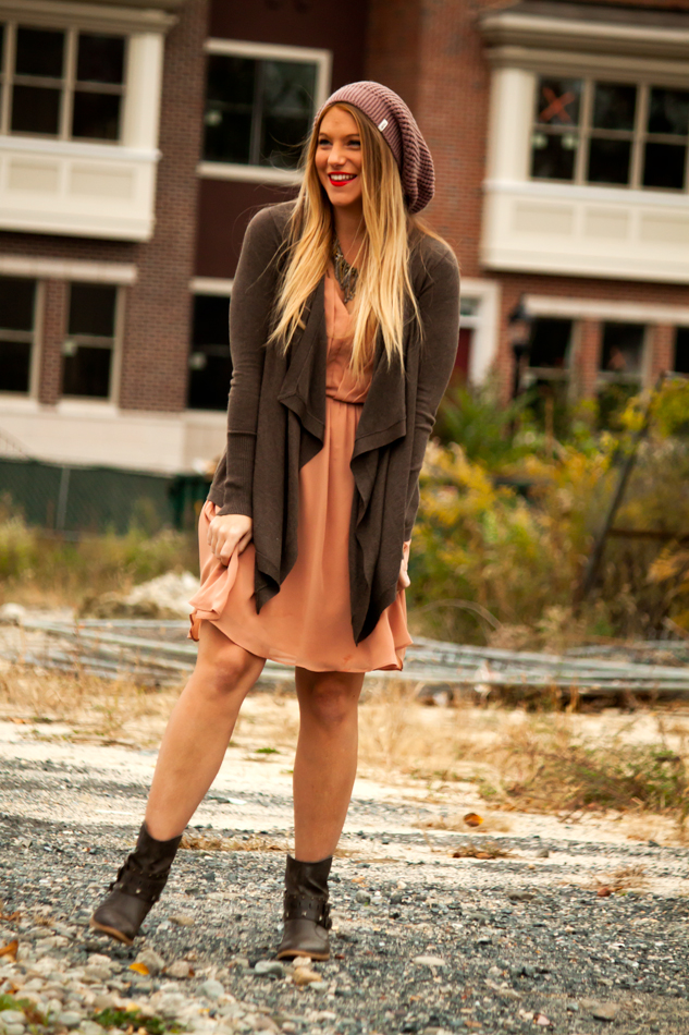 {LC Lauren Conrad for Kohl’s dress (also seen here); ℅ Karen Kane sweater; Target booties; TNA hat via Aritzia (also seen here); Gemma Redux necklace}