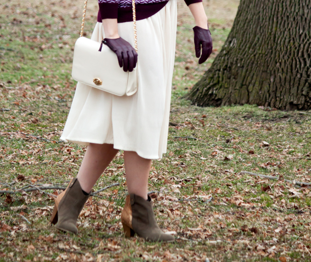 {J. Crew sweater (similar) and earrings (similar from Asos); American Apparel skirt; H&M gloves; Just Fab booties (check out my glitter d.i.y.!); vintage purse (similar from Forever 21); Ray Ban sunglasses}