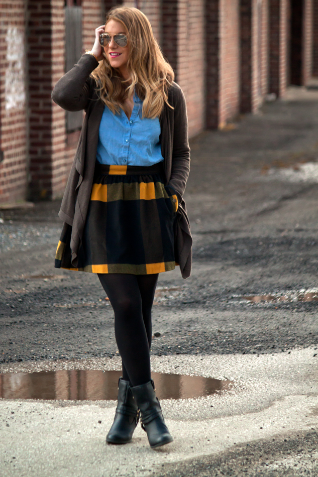 {H&M chambray shirt (similar from Piperlime); ℅ Karen Kane sweater; Free People skirt via Gilt; Just Fabulous boots; ℅ ESQ Movado watch; Ray Ban sunglasses; J. Crew ring; misc. earrings (similar from Macy’s) and tights (similar from Asos)}
