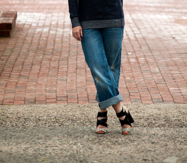 I know we’re all getting tired of complaining about the weather; well, at least I am. It seems like I can’t plan my outfits in advance because I could wake up and it could be 80 and sunny or 50 and damp. I’m making the best of these chillier days by braving some cold toes and pulling out my new sandals while keeping covered with an old pair of boyfriend jeans and a sweater, and reaching for a statement-making accessory to top it off.