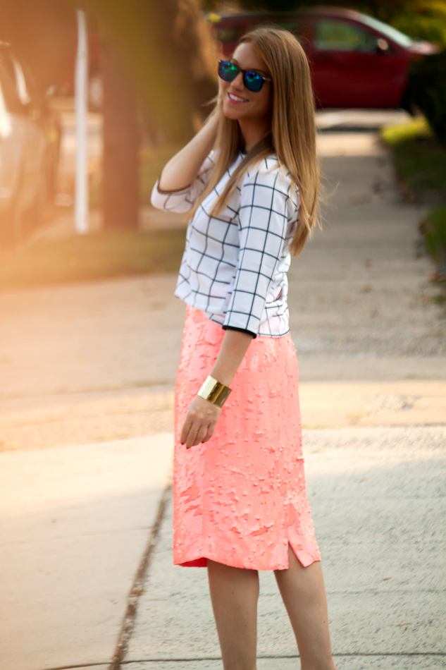 {℅ Choies top; J. Crew skirt and cuff; ShoeMint heels; Vault sunglasses}