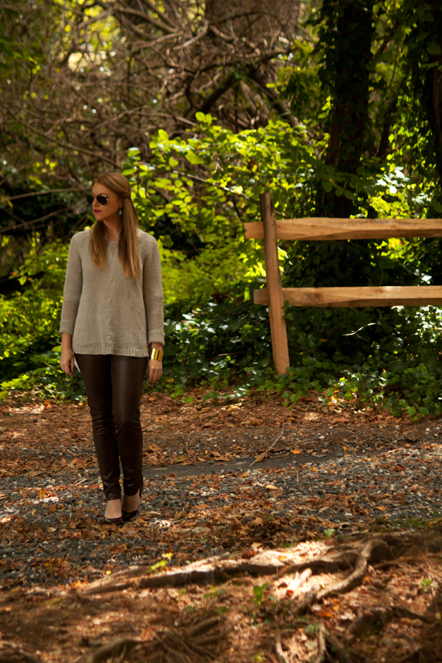 {℅ Karen Kane faux leather leggings; H&M shirt (old, similar from H&M); ℅ Jigsaw London sweater; ℅ Just Fabulous Amelie heels; J. Crew cuff; Anthropologie earrings (old, similar from Anthropologie); Ray Ban sunglasses}