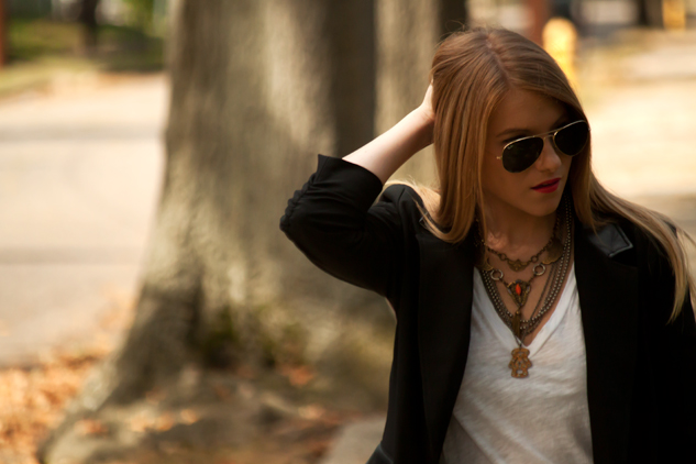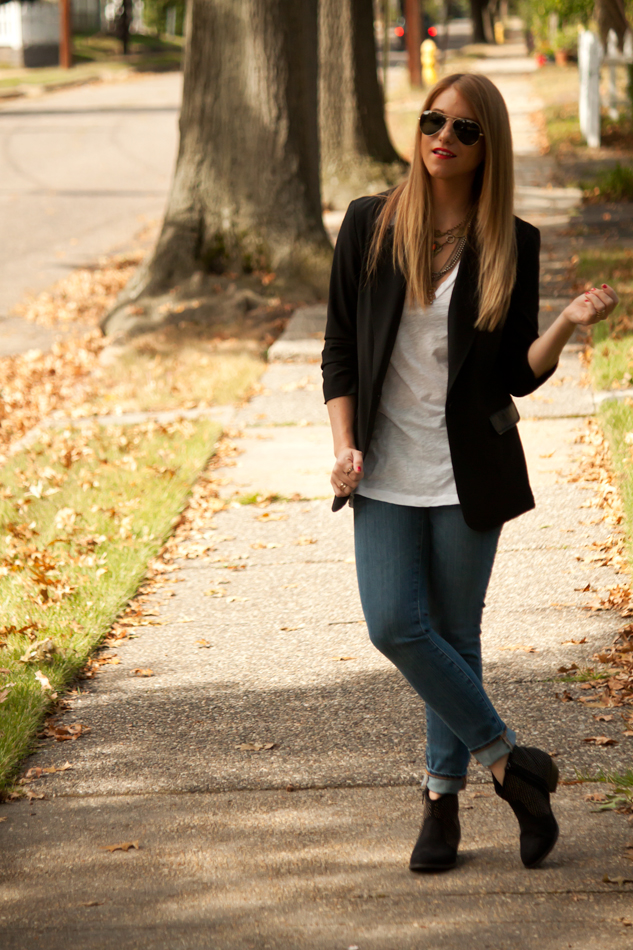 {℅ Karen Kane blazer; J. Crew denim and t-shirt; ℅ Just Fabulous Haylen booties; ℅ Sheer Addiction necklace; Angel Court necklace from RocksBox; Ray Ban sunglasses; Forever 21 rings}