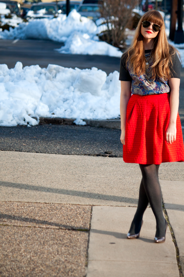 I love this comfy little dress and while it works perfectly fine on its own, I’ve found myself eyeing it up with different skirts in my closet lately. (In hindsight it probably would be pretty cute with this purple one.) I love the way the jacquard fabric plays against the bold red of the skirt though, and with some complimenting metallics, creates a fun, winter-worthy outfit.
